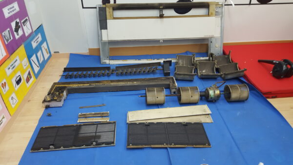 熱交換器(アルミフィン)と送風ファンを中心に洗浄していきます。