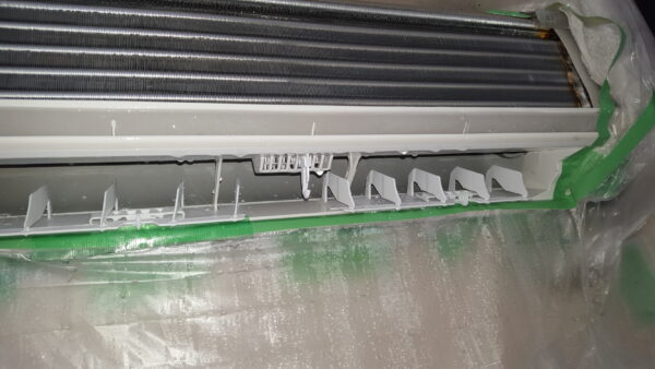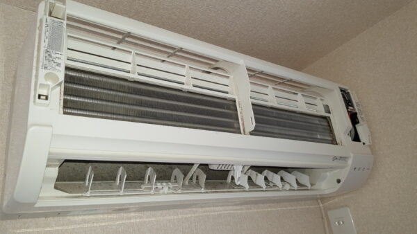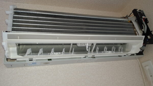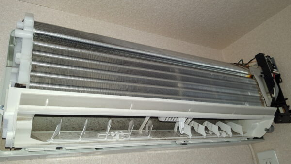 外装カバー・フィルター・ルーバーを取り外し、内部の熱交換器や送風ファンを確認。